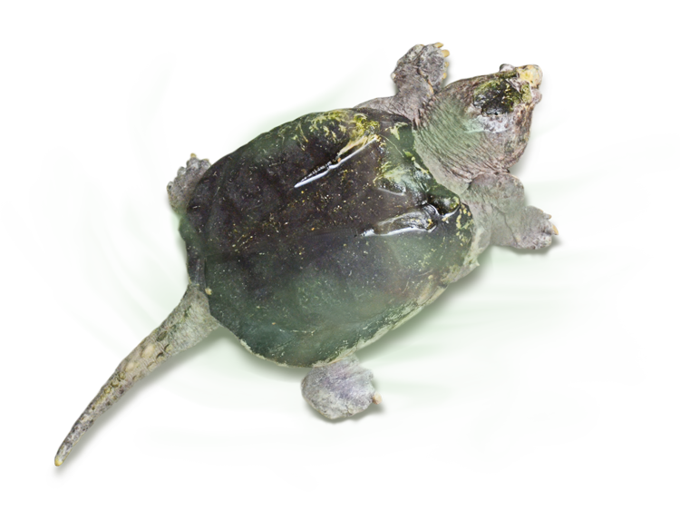 最大で甲長は80cm、体重は100kgを超えます。北アメリカ原産のカミツキガメの仲間ですが、一種のみでワニガメ属を形成し、系統的にもきわめて貴重な存在です。