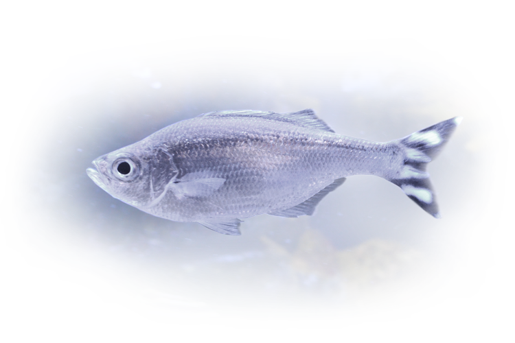 体長は25〜30cmほど。アフリカ南東部から日本、オーストラリアに至るインド太平洋域に広く分布する沿岸性の魚です。全身は銀白色で、尾鰭には旗のように並ぶ5本の黒色帯があり、比較的大きな目とともに本種を見分ける特徴となっています。サンゴ礁や岩礁域、河口の汽水域に生息し、幼魚は潮だまり(タイドプール)でも観察されます。小規模な群れをつくって行動し、夜行性で、動物プランクトンや小魚、甲殻類などを捕食します。