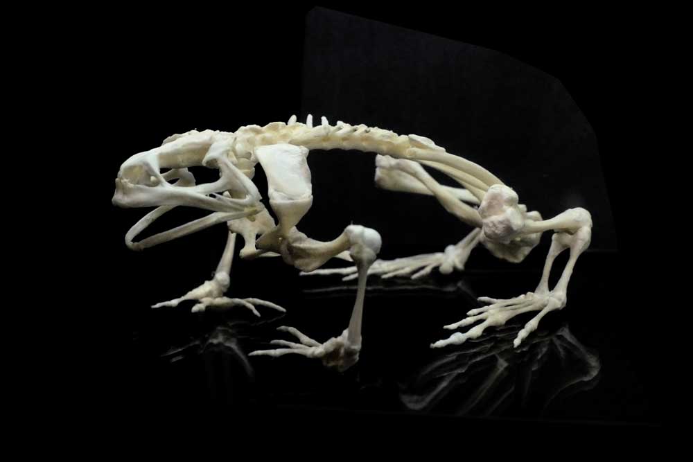 The skeleton of a Japanese common toad. Frogs are characterized by having an extremely small number of bones compared to other animals, such as no ribs.
