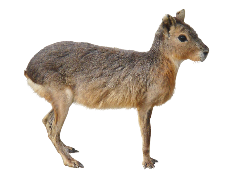 南アメリカ、パタゴニアの草原に生息します。体長60 – 73cm、 尾長4cm、体重9 – 16kg。四肢は細く長く、短い尾は毛に覆われていません。耳が大きく、見た目はウサギに似ていますが、ネズミの仲間でモルモットに近い種類とされています。