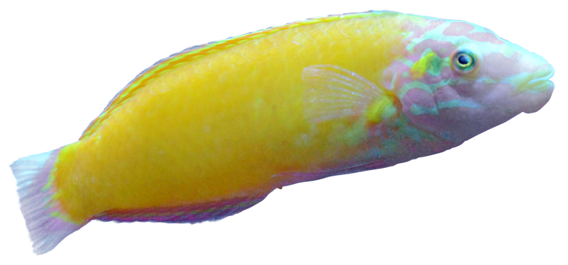 その名の通り黄色い体色が特徴で、ヤマブキベラのメスにもよく似ていますが、こちらはオスも黄色い体色です。幼体やメスの頃は背ビレに眼状斑を持ちますが、成熟してオスになると背ビレの黒色班は前方に一つのみになり、頬の水色の帯状斑がくっきり鮮やかになります。